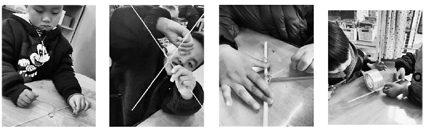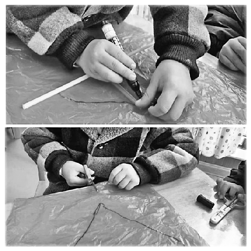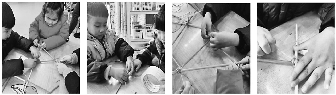 3. 分组进行合作尝试:制作风筝面,绑骨架,系风筝线。