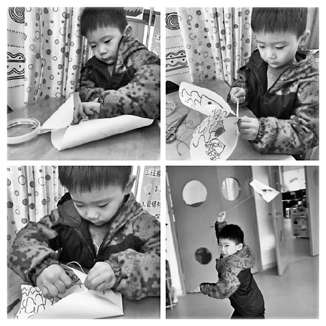 在设计风筝面、绑骨架、绑风筝线的过程中,幼儿更是发展了不怕困难、敢于尝试与探索的游戏精神,意志品质得到提高。活动中,幼儿积极动手动脑,充分发挥已有经验和团结合作的力量,在反复尝试中制作出属于自己的风筝,并在一次又一次的放飞实践中总结经验,探索出放风筝的秘诀,知道了如何制造风并控制风的大小,放风筝时该如何判断风向,规划奔跑的路线;还了解了适宜放风筝的场地应是空旷、平坦的。此外,在放风筝的过程中,孩子们锻炼了四散跑、躲避跑的运动技能和手臂力量的控制能力,肌肉动作得到发展。在面对掉落的风筝时,孩子们也没有放弃,而是认认真真地将风筝线一圈一圈地绕回线板上,手眼协调能力得到了良好发展。