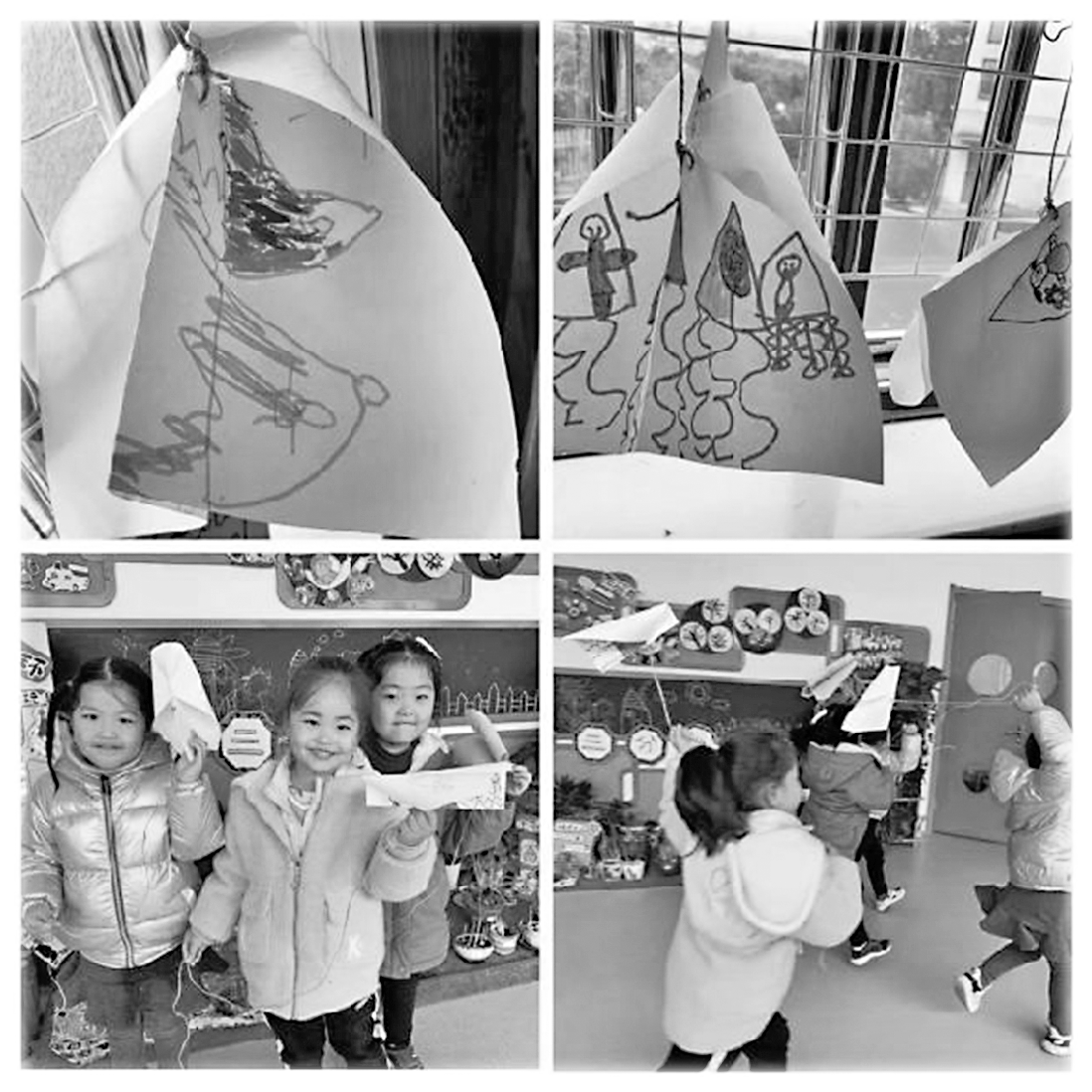 飞机和风筝有着些许相似之处,于是幼儿在纸飞机的基础上改良做出了一种新型的“飞机风筝”,这种风筝制作材料简单方便:只需要在纸上画出喜爱的图案,用胶棒将“机翼”固定,并将麻绳或其他风筝线材料与之连接即可。