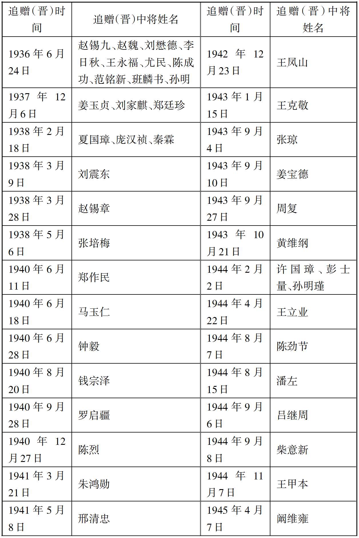 自1935年至1945年抗战胜利,国民政府追赠赵锡九、赵魏、刘懋德、李日秋、王永福、尤民、陈成功、范铭新、班麟书、孙明、姜玉贞、刘家麒、郑廷珍、赵锡章、张培梅、钟毅、钱宗泽、赖传湘、李翰卿、寸性奇、王凤山、王克敬、黄维纲、周复、许国璋、彭士量、孙明瑾、王立业、吕继周、柴意新、陈可钰、陈维沂等人为陆军中将;追晋郑作民、马玉仁、罗启疆、陈烈、朱鸿勋、邢清忠、戴安澜、张琼、姜宝德、潘左、王甲本、阚维雍、陈济桓等人为陆军中将。