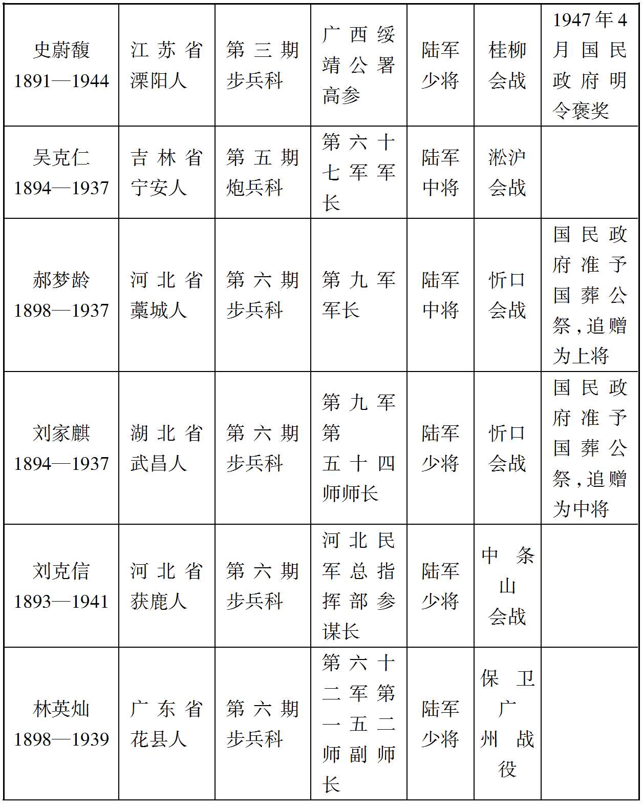 表2-2 抗战时期牺牲的保定军校毕业生将领统计表