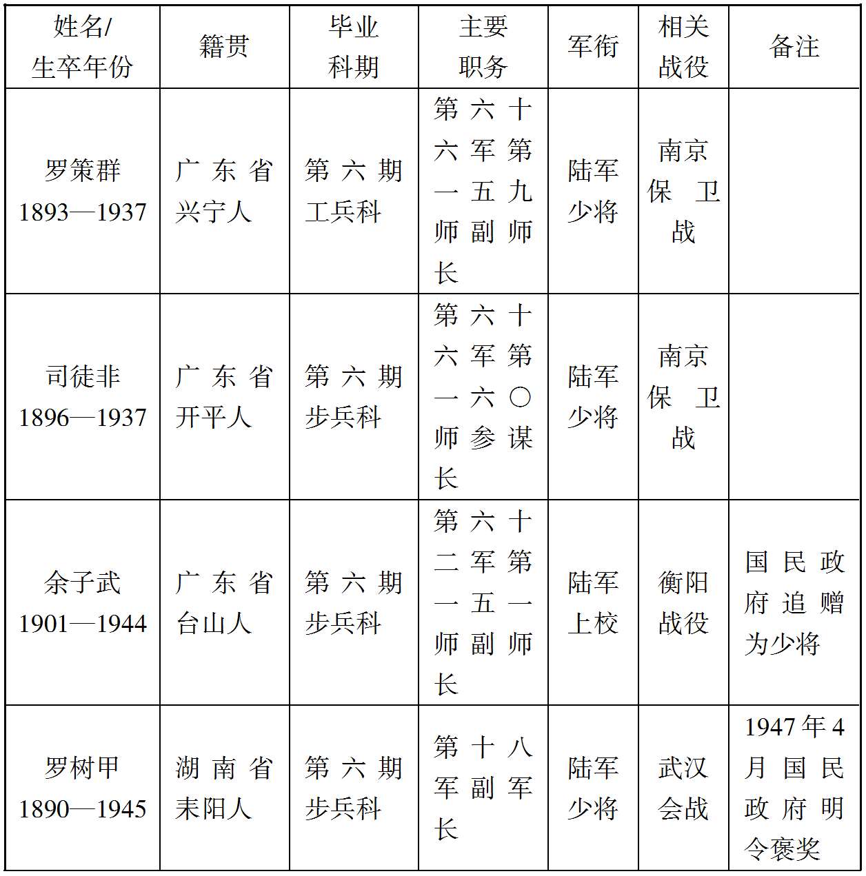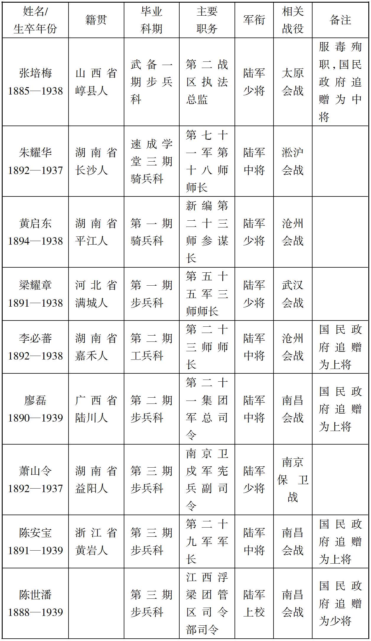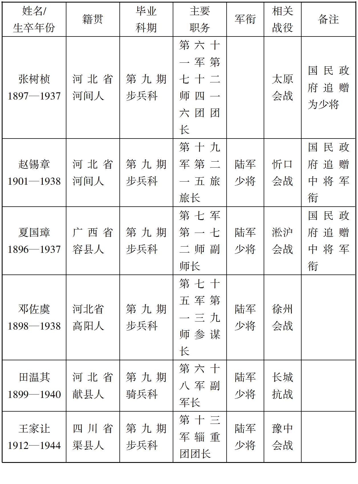 资料来源:王铁群、张建利、张俊合:《保定军校毕业生与抗日战争》,《河北大学学报》(哲学社会科学版)2003年第2期;王哲新、刘志强、任方明编:《保定陆军军官学校校史研究》,北京:中国社会出版社2005年版,第621—622页;民政部:《著名抗日英烈和英雄群体名录》,2014年,2015年,2020年。