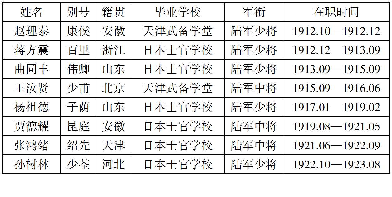 1912年中华民国成立后,为了便于管理,陆军预备大学堂改名为陆军大学校,并迁往北京。同年,在保定陆军军官学堂旧址,陆军部决定建立“陆军军官学校”,并于10月20日正式开学。此校目的为“造就初级军官之所,专收各兵科军官候补生,教以初级军官必修之教育”。 (5) 在管理层面上,学校以校长为最高负责人,统辖教育长、各科教员等;课程设置上,学校不仅注重近代学科知识的教育,而且还十分重视对学生的野外军事训练、军事演习和军械制造等。1923年,因为军阀混战、北洋政府财政困难以及军校内部的种种矛盾,保定军校停办。