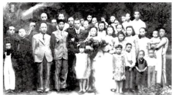 1944年中秋,李庄张家四妹问贤(左六)与张松华(左五,穿黑西装)婚礼在大房山庄举办。二排大人左起张问郯(官周),蔡翼公、李济,右一张官周夫人袁继誉(张仲杰提供图片及说明)