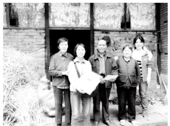 2017年4月21日陈流求偕女儿董景宜、董景同、董晓红到李庄桂花坳傅斯年旧居,与现房主张家友夫妇合影(陈流求供图)