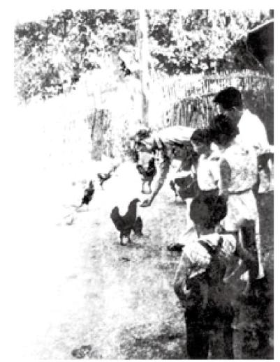 1941年夏天,金岳霖在上坝梁林家后院喂鸡。前为刘致平之女刘康龄、后左为梁从诫、中为梁再冰、右为梁思成(梁从诫供图)