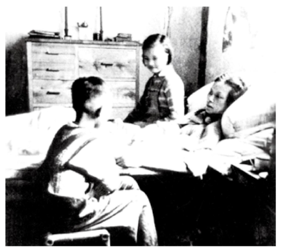 1941年在李庄上坝家中,女儿再冰、儿子从诫在母亲林徽因病榻前(梁从诫供图)
