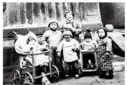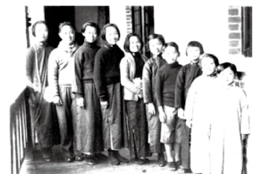 1940年代,社会所的孩子李庄石崖湾合影。右一徐义生长女徐璧云,右二宗井滔之女宗丕庄,后排高者为彭雨新大女彭一民,左二为梁方仲长子梁承邺,左一左三为彭小弟及梁小妹(董杰供图)