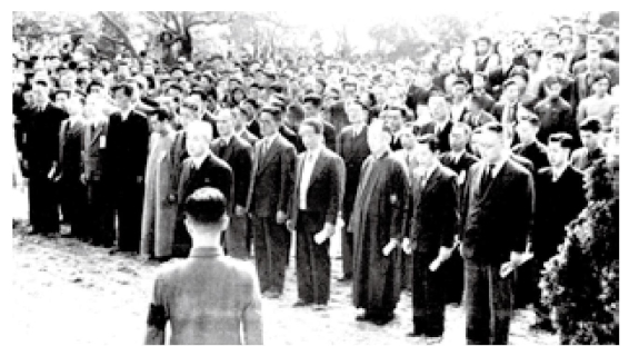 1949年6月29日中博院新生纪念。右起一排李诚贤、□□□、曾昭燏、王英(军代表)、□□□(军代表)、萧温(军代表)、□□□、曹志宏、□□□、□□□;二排陈炽、王宜容、宋伯胤、尹焕章、王天木、□□□、张正祥、梅晓春、□□□、□□□;三排□□□、董启炎、赵乡珊、沈运生等(李在中供图并说明)