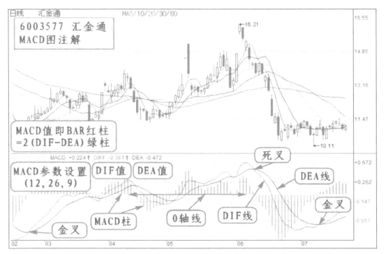 (2)MACD日线图图例:汇金通(603577)2018年2月到7月MACD系统图。上面是K线图,下面是对应的MACD系统图。MACD系统由两线一柱组成,图里面的MACD(12,26,9)说明计算参数是以12日、26日、9日的EMA值进行的;代表EMA离差值的DIF线是快行线,在图中最后一个交易日DIF值-0.361;代表DIF多日平滑移动平均值的DEA线是慢行线,在图中最后一个交易日的DEA值-0.472;指标图中上下长短不一的线柱是MACD柱即BAR柱,它的值是2(DIF-DEA),正值时一般标注为红柱,负值时标注为绿柱;红柱和绿柱起始处形成的位置是0轴线,这个地方MACD值为0,在图中最后一个交易日的BAR值+0.224。在快线DIF和慢线DEA交叉的地方,MACD值为0,对应图中K线图,当DIF向下与DEA交叉叫死叉,可以看出股价正在下跌之中;当DIF向上与DEA交叉叫金叉,可以看出股价正在上涨之中。