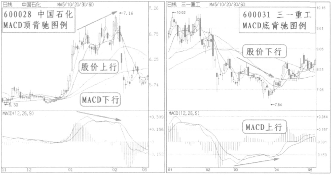 ①MACD背驰:一般情况下,股价下跌,MACD曲线也是下行趋势,股价上涨,MACD也是上行趋势,但是在一些情况下特别是经过一段时间上涨以后,会发现股价经过回调后重新走高,但是MACD曲线却逐步走低,这就是顶背驰;反之在一些情况下特别是经过一段时间下跌以后,会发现股价经过反弹后重新走低,但是MACD曲线却逐步走高,这就是底背驰。例如中国石化(600028)2017年11月到2018年3月的顶背驰及三一重工(600031)2018年1月到5月的底背驰。