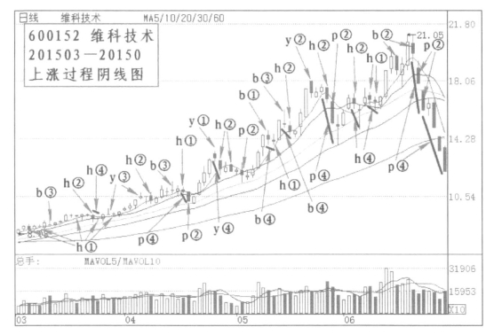 (三)上涨过程中的阴线图解:维科技术(600152)2015年3月到2015年6月是一段时间较长的上涨走势,包含有各种阴线形态。通过这个图我们可以初步认识阴线的各种形态及发生的位置。