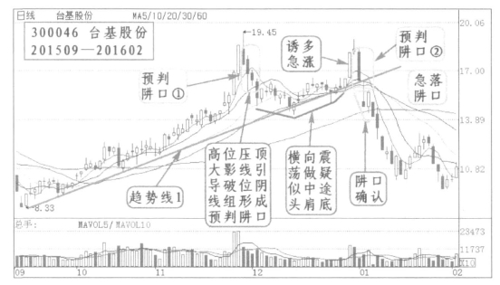 (1)例1:台基股份(300046)在2015年11月下旬,连续急涨后由高位压顶大影线引导破位阴线组形成,预判阱口①;后受30线和趋势线1支撑横盘运行,到12月29日启动急速上涨,31日出现一个压顶上影阴线,预判阱口②。2016年1月4日大阴跌停,1月5日出现上影巨震线并跌停,阱口确认。最佳操作策略是警觉到12月31日的上影阴线的风险;一般情况下许多人会认为是中途盘整突破,对赢利抱有希望;次一等策略就是1月4日大阴下跌之初,意识到阱口来临并及时空仓;其后怎么做都很亏。