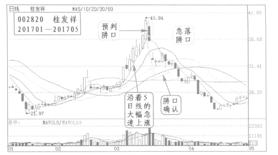 2.急涨急落阱口:多见于新股次新股炒作过程。一轮沿着5日线急速且幅度很大的上涨,然后几天盘整或者没有盘整,直接巨阴或跌停下跌。如桂发祥(002820)2017年3月。3月3日启动一轮沿着5日线的急速上涨,到3月16日后,出现伴随大阴线并跌停,接着出现一个带反弹小阴跌停。最佳策略是3月15日冲高出局,或者16日开盘后冲高回落及时出局。