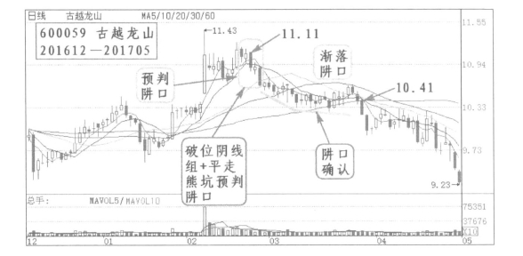 (1)例1:古越龙山(600059)2017年2月下旬出现破位阴线组和平走熊坑,预判阱口;从2月23日第一根中阴线出现到3月29日破位大阴线出现,阱口确认,时间约1个月,股价11.11~10.41元,跌幅6.3%。这段时间可以从容出局或做一些高抛低吸。