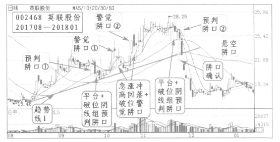 (2)例2:英联股份(002846)2017年9月下旬出现破位阴线组,预判阱口①;10月到11月出现两次急涨冲高回落并破位,要警觉阱口出现;11月2日到24日形成平台走势,23日后形成破位阴线组,预判阱口②;28日跌破60线,阱口确认。23日上影巨震线空仓是最佳策略,次一等是27日空仓,以后没有机会了。