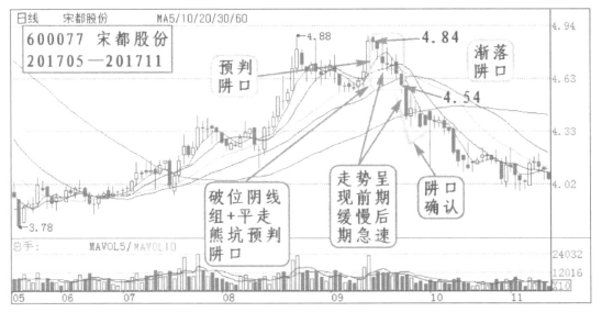 (2)例2:宋都股份(600077)2017年9月14日后出现破位阴线组和平走熊坑,预判阱口;14日收盘到22日出现破位阴线,时长7个交易日,股价4.84~4.54元,幅度6.2%。可以从容出局。