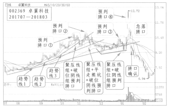 (2)例2:卓翼科技(002369)2017年10月末出现聚压线组和破位阴线组跌破20线与趋势线3,预判阱口①;11月中旬出现聚压线组和破位阴线组形成平走熊坑,跌破30线和趋势线2,预判阱口②;12月上旬跌破60线,渐落阱口即将确认之际,依托趋势线1横盘运行,12月末到2018年1月初出现聚压线组和破位阴线组跌破60线,预判悬空阱口③;1月5日到9日在线下形成横盘,10日突然涨停横托形成,平台突破连续2天涨停,第3天高位压顶+抛压大阴线,预判阱口④;其后跌停并形成破位阴线组,阱口确认。最佳操作策略是顶部大阴线空仓;其后怎么做都很亏。