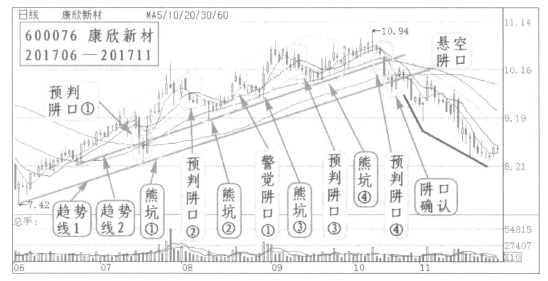 (一)急落阱口:基本是以尖顶形态出现,此前一轮急速且幅度很大的上涨,股价远离5日线、10线,初期大跌并未破线,而当破线的时候,跌幅也非常大。这样的阱口必须在上涨末端或第一根阴线出局,否则连出局机会都没有。有两种形态。