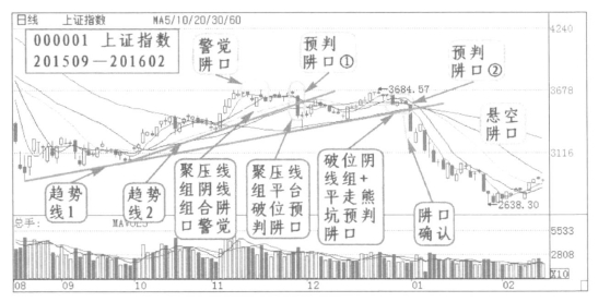 (1)例1:沪指2015年11月中旬连续出现聚压线组和横盘回调阴线组,要警觉阱口出现,11月27日大阴线跌破聚压线平台,预判阱口①;12月末连续聚压线横盘,均线聚集,2016年1月4日大阴破位,形成平走熊坑+破位阴线组,即时让指数跌到所有均线之下,预判阱口②,其时出现千股跌停,悬空阱口确认。最佳操作是预判阱口②出现时空仓;次一等操作是先减仓到50%以下,跌破均线的时候空仓。