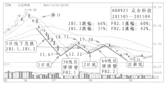 2.图例分析:如众合科技(000925)2015年5月到9月。在2015年6月10日见顶34.55元,阱口形成后一段5日线下急跌阱壁JB1.1,跌幅66%,出现反转1日底,其后9个交易日形成反弹阱壁FB2.1,由于反弹高于20线低于30线,所以也叫30线下反弹,急跌之后发生急涨,上涨60%;7月24日反弹见顶又一次下跌展开,6个交易日形成一段5日线下急跌阱壁JB 1.2,跌幅35%,此次下跌并未跌破前期低点,出现反转2日底,其后8个交易日形成反弹阱壁FB2.2,由于反弹高于30线低于60线,所以也叫60线下反弹,上涨42%;此次反弹见顶后又翻转下跌,并跌破前期低点,出现新低8.66元,跌幅51%;从34.55元到8.66元整个中期下跌跌幅75%。