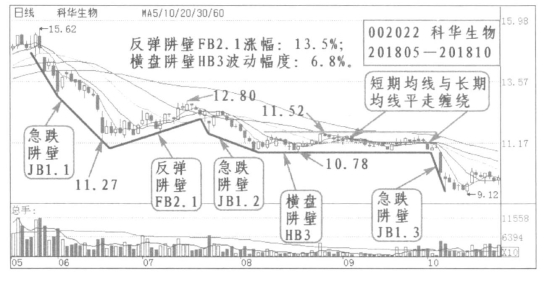 2.图例分析:如科华生物(002022)2018年5月到10月。2018年8月到10月有一段横盘震荡阱壁HB3,波动幅度6.8%,横盘过程中5日线、10线、20线、30线逐步走平并纠缠聚合延续。在横盘末端均线纠缠被突然打破,然后以5日线下破位急跌的形式大幅下跌。