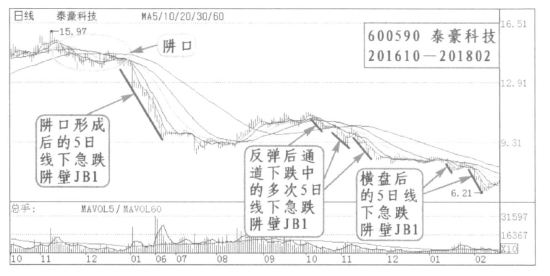 2.图例分析:如泰豪科技(600590)2016年10月到2018年2月。阱口形成后一段5日线下急跌阱壁引起大幅下跌;经过反弹后的通道下跌过程中含有多段5日线下急跌的阱壁;横盘后有两段5日线下急跌的阱壁。