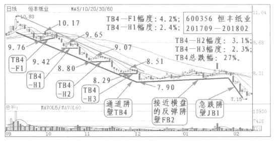 3.通道阱壁的波动分析:当股价在通道内运行并下跌时,必然存在股价在均线之间的反弹运行或横向运行,并且以横盘运行居多,以5日线向10线移动居多,在这个过程中上级均线波动不大并以一定斜率向下运行。如恒丰纸业(600356)2017年9月到2018年2月。前一段反弹完成后,股价又一轮下跌,形成一段以5日线下急跌并向10线回归交替进行的20线下的通道下跌阱壁TB4,其中包含4段回归走势,通道内反弹TB4-F1波动幅度4.2%;通道内横盘TB4-H1波动幅度2.4%;横盘TB4-H2波动幅度3.1%;横盘TB4-H3波动幅度2.3%;整个通道阱壁TB4下跌幅度27%。可以看出在通道内5日线向10线回归运行时波动幅度不大,一般小于6%,并且在运行的末端5日线与10线黏合,然后继续下跌,但是20线、30线没有多大波动并以一定斜率向下运行。