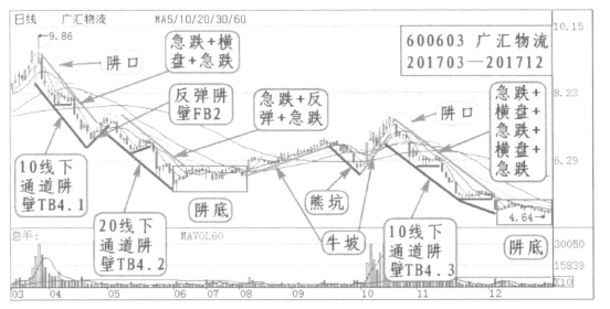 2.实例分析:如广汇物流(600603)2017年3月到12月。阱口由一段5日线下破位急跌引出,然后横盘向10线靠拢,形成10线下的通道运行阱壁TB4.1;再一次5日线下急跌后出现穿过10线向20线靠拢并形成20线下反弹阱壁FB2;反弹后出现第二段下跌,由一段5日线下急跌启动,然后反弹向10线靠拢并短时超过10线,接着又一次5日线下急跌形成20线下的通道运行阱壁TB4.2;新一轮上涨完成于10月20日,阱口依然由一段5日线下破位急跌引出,然后横盘向10线靠拢,形成10线下的通道运行阱壁TB4.3,此次通道下跌带有两次由5日线向10线的横盘。