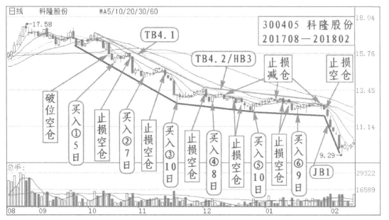(1)例1:科隆股份(300405)2017年8月到2018年2月。从2017年9月1日最高的17.58元,一直跌到2018年2月7日的最低点9.29元,延续5个月,下跌幅度48%。下跌由通道阱壁TB4.1+接近横盘的通道阱壁TB4.2/HB3+急跌阱壁JB1组成。