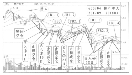 (2)例2:物产中大(600704)2017年9月到2018年3月。从2017年10月16日最高的8.17元,一直跌到2018年3月23日的最低点5.94元,延续5个月,下跌幅度27%。阱口形成后,下跌由急跌阱壁JB1.1+横盘阱壁HB3+急跌阱壁JB 1.2+反弹阱壁FB2.1+急跌阱壁JB1.3+反弹阱壁FB2.2+急跌阱壁JB 1.4组成。