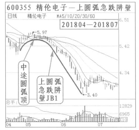 上圆弧急跌阱壁形态特征:下跌过程中,K线实体大部分在5日线下,开始下跌缓慢,与前面的K线组合形成下跌中途圆弧顶,后面跌速加快,走势接近典型急跌阱壁。