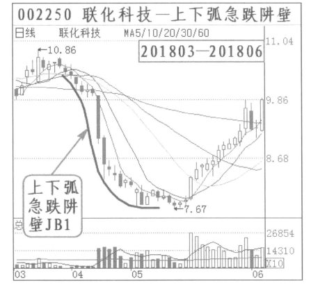 (六)上下弧急跌阱壁:联化科技(002250)2018年3月到6月,出现上下弧急跌阱壁。