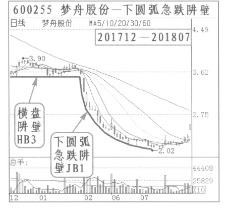 (三)下圆弧急跌阱壁:梦舟股份(600255)2017年12月到2018年7月,出现下圆弧急跌阱壁。