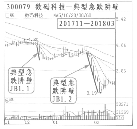 (一)典型急跌阱壁:数码科技(300079)2017年11月到2018年2月,出现两次急跌阱壁,都是典型急跌阱壁。