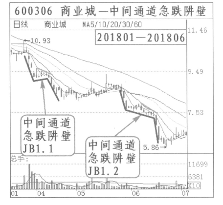 (五)中间通道急跌阱壁:商业城(600306)2018年1月到6月,连续出现两次中间通道急跌阱壁。