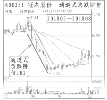 (四)通道式急跌阱壁:冠农股份(600251)2018年5月到8月,出现通道式急跌阱壁。