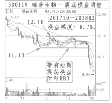 (二)带有短期震荡的横盘阱壁:瑞普生物(300119)2017年10月到2018年2月出现带有两次短期震荡的横盘阱壁。