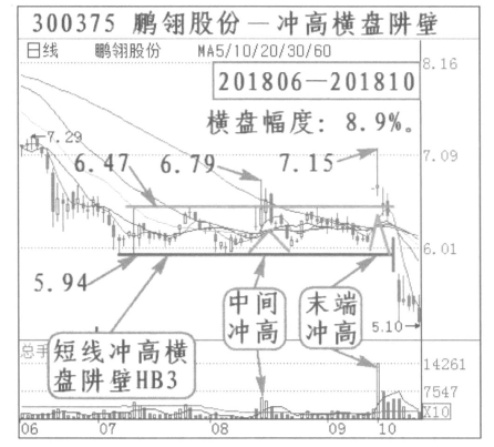 (三)带有短线冲高的横盘阱壁:鹏翎股份(300375)2018年6月到10月出现带有多次短期震荡和两次短线冲高的横盘阱壁。