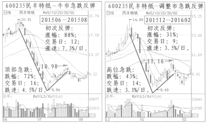 (1)民丰特纸(600235):2015年1月到2018年4月有两次顶部急跌反弹。