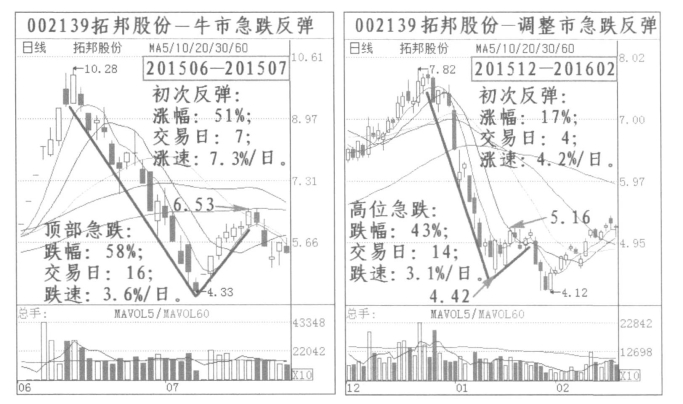 (1)牛市行情:从牛市头部2015年6月15日的5178点开始一直到2015年7月9日的3373点的急跌,下跌幅度35%,时长18个交易日,跌速1.9%/日;其后反弹到4184点,幅度24%。2015年牛市下跌时绝大部分个股走势形态与大盘相近,其中大部分个股跌幅和跌速大于大盘;而反弹上涨时的幅度也大于大盘。同期深成指、创业板也出现同样走势,深成指由18211点跌到最低10850点,下跌幅度40%,时长17个交易日,跌速2.4%/日,其后反弹到13970点,幅度29%;创业板由3919点下跌到最低2304点,幅度41%,时长17个交易日,跌速2.4%/日,其后反弹到3014点,幅度31%。