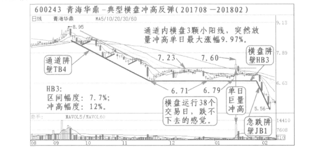 ②青海华鼎(600243):2017年8月到2018年2月,有一次横盘冲高反弹。虽然该股为沪股,但是却和创业板2017年11月到2018年1月29日横盘相呼应,表明了调整市大盘指数和个股之间分化严重。2017年10月11日高点8.95元,经过通道运行下跌到11月20日的6.71元,然后开始横盘,股价在7.7%的小幅度内横向运行,经过38个交易日运行到通道下轨,出现低位三个小阳线,于2018年1月16日突然巨量大幅冲高,一度超过60线,当日最高涨幅9.97%,总涨幅12%。