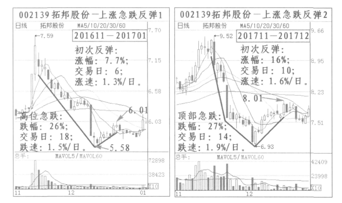 ③上涨行情急跌反弹1:2016年11月17日到2016年12月14日独立上涨行情见顶急跌反弹。11月17日最高7.59元,12月14日最低5.58元,下跌幅度26%,下跌时长18个交易日,跌速1.5%/日;反弹到12月22日的6.01元,反弹幅度7.7%,时长6个交易日,涨速1.3%/日。显然一般性的独立上涨行情,下跌和上涨幅度相对于与大盘同步的行情要小。