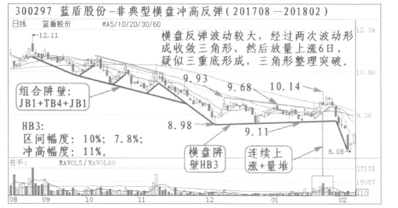②蓝盾股份(300297):2017年8月到2018年2月,有一次横盘冲高反弹走势。与创业板2017年11月到2018年1月29日横盘相呼应。2017年11月经过急跌下跌到12月6日的8.98元,然后开始横盘,股价在小幅度内横向运行,并形成底部逐步抬高的下轨和顶部逐步下降的上轨,2018年1月17日放量大幅冲高开启第三次反弹,超过60线,总涨幅11%。给人一种三重底形成、三角形整理突破的感觉。
