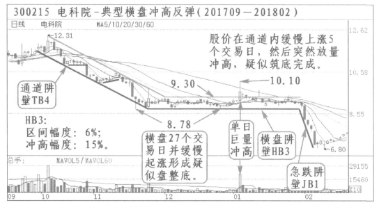 ①电科院(300215):2017年9月到2018年2月,有一次横盘冲高反弹走势。与创业板2017年11月到2018年1月29日横盘相呼应。2017年10月12日高点12.31元,经过通道运行下跌到11月20日的8.75元,然后开始横盘,股价小幅度横向运行,27个交易日运行到通道下轨,并开始反弹运行5个交易日,于2018年1月4日突然巨量大幅冲高,一度超过60线,当日最高涨幅10.36%,总涨幅15%。