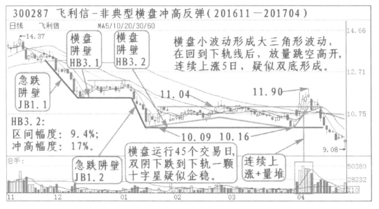 ①飞利信(300287):2016年11月到2017年4月,出现一次横盘冲高反弹,发生于2017年1月到4月,和大盘指数不同步,属于独立行情。2016年11月经过急跌横盘再急跌到2017年1月16日的9.98元,稍作反弹然后股价在小幅度内横向运行,经过45个交易日运行到通道下轨,出现双阴破位带一个小阳十字星,于2017年4月5日突然放量大幅冲高,连涨5日,超过60线,有巨大换手率的量堆形成,最高涨幅17%,给人一种下跌企稳双底已经形成的感觉。横盘通道内部的波动是一个上涨回落的三角形形态,由于波动幅度小于12%,并且回落后又一次上涨的位置与前次低点接近,所以按横盘运行分析。
