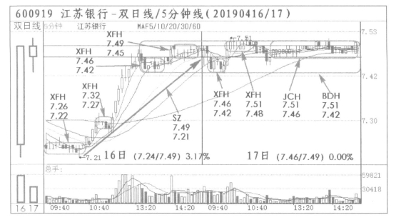 (4)实例观察:这里以小阳线为例。如江苏银行(600919)2019年4月16日和17日走势。16日开盘7.24元,收盘7.49元,上涨3.17%;17日开盘7.46元,收盘7.49元,上涨0.00%。第2个交易日的开盘价比第1个交易日收盘价低0.03元,虽然是阳线但是收盘价与第1个交易日相同,整个K线在第1个交易日收盘价附近,成交缩量。第1个交易日5分钟线是一段又一段小幅横盘+上涨的形态,整体涨幅0.28元,约3.88%;第2个交易日5分钟线是一段又一段小幅横盘+上涨+回调的形态,与第1个交易日后期连接,形成了波动横盘走势,幅度0.09元,约1.21%,其中更有较长的幅度0.05元的纠缠横盘走势。第1个交易日10、20、30、60单元线以一定斜率上升,是上涨形态;第2个交易日则是横盘形态,5、10、20、30、60单元线逐步走平。很明显股价在一个区域遇到阻力,进行横盘整理,无论第2个交易日是小阳线、小阴线或十字线,也无论在这里波动多大,都说明这个区域有相当大的阻力。这种形态在上涨行情或反弹行情的初期、中期和末期都有出现,在上涨行情初期或强势上涨主升浪中,可以看作是上涨中继整理形态,一般后面会继续上涨,但是在调整行情中或上涨行情后期,是一种上涨遇阻的滞压线,其后会有回调,回调后遇到下一级支撑线是否会反转上涨不能确定。