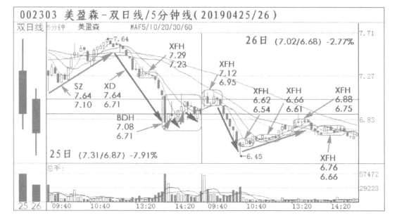 6.并入阴线与分钟线:如美盈森(002303)2019年4月25日和26日走势。25日开盘7.31元,收盘6.87元,下跌7.91%;26日开盘7.02元,收盘6.68元,下跌2.77%。第2个交易日的开盘价与第1个交易日收盘价相差0.15元,形成跳空高开然后下跌的形态,成交缩量。5分钟线大部分走势是一段又一段小幅横盘+下跌的形态,形成一波比较复杂的波动走势,整体跌幅0.69元,约9.43%。同样是连续下跌,但是第2个交易日跳空高开约2.24%,说明下跌遇到有限支撑,对第1个交易日的下跌做了调整,整个运行过程中在6.71元到7.12元之间进行了长时间的波动整理,均线系统里面只有60单元线呈一定斜率的下行态势,其他呈现下行及横盘纠缠运行。这种形态一般出现在较强的下跌趋势开始位置或下跌过程中有相对支撑的位置,在回调行情和主跌浪中出现,表明一次下跌在犹豫中开始并延续,这样的走势一般情况下还是要继续下跌。
