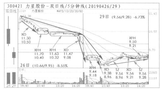 4.跳空阴线与分钟线:如力星股份(300421)2019年4月26日和29日走势。26日开盘10.66元,收盘9.95元,下跌8.55%;29日开盘9.56元,收盘9.28元,下跌6.73%。第2个交易日的开盘价与第1个交易日收盘价相差-0.35元,形成跳空低开形态,成交量微幅放大。5分钟线走势是一段又一段小幅横盘+下跌的形态,形成一波大部分股价在20单元线下方的下跌走势,最大跌幅1.70元,约15.9%。整个运行过程中,有两波大幅波动,小幅度横盘较多,60单元线呈一定斜率的下行态势。第2个交易日后半部短期单元线出现上涨并横盘走势。这种形态一般出现在较强的下跌趋势中,在行情深幅回调和主跌浪中较多,表明一次强烈下跌正在进行。这种形态可以出现在行情的初期、中期或末期,依据此前走势和成交量状态进行分析。
