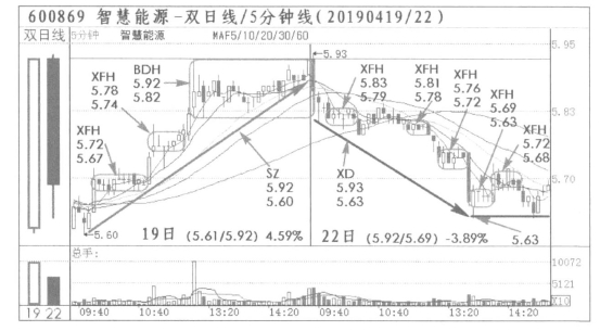 (4)实例观察:这里以平开为例。如智慧能源(600869)2019年4月19日和22日走势。19日开盘5.61元,收盘5.92元,上涨4.59%;22日开盘5.92元,收盘5.69元,下跌3.89%。第2个交易日的开盘价与第1个交易日收盘价相同,形成平开然后下跌的形态,成交缩量。第1个交易日5分钟线是一段又一段小幅横盘+上涨的形态,整体涨幅0.32元,约5.71%;第2个交易日5分钟线是一段又一段小幅横盘+下跌的形态,整体跌幅0.30元,约5.05%。第1个交易日20、30、60单元线以一定斜率上升,整体保持了上升形态,后期是一个波动横盘的走势,说明这里有一定阻力做了整理;第2个交易日开盘即大阴下跌,随后一直保持下跌,20、30、60单元线逐步形成一定斜率的下行,而且下行幅度较大。很明显19日后期的波动形成了短期头部,说明行情由上涨转为下跌。这种形态在上涨行情或反弹行情的初期、中期和末期都有出现,一般后面会继续下跌,但是在遇到均线支撑后,会有反弹,反弹后反转继续上升或继续下跌。如果发生在上涨初期,由于上涨幅度较小、上升阻力不大,遇到均线支撑会反转继续上涨,随着行情上涨的幅度加大,反弹后继续下跌的概率越来越大。